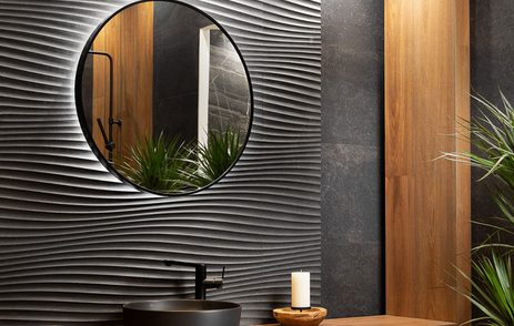 Dieses Bad vereint ästhetisches Design mit praktischer Raffinesse. Die Wandgestaltung in sanfter Wellenoptik bringt Bewegung und Tiefe in den Raum – ein Spiel von Licht und Schatten, das für Ruhe und Eleganz sorgt. Die wasserabweisende Tapete ergänzt das Konzept perfekt und verbindet moderne Technik mit stilvollem Auftritt.